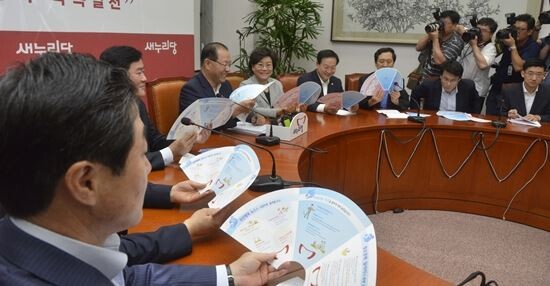 15일 오전 서울 여의도 국회 새누리당 대표실에서 열린 최고위원회의에서 황우여 대표와 최경환 원내대표등 당직자들이 접으면 부채가 되는 민생정책홍보 자료를 보며 시연을 해보고 있다. (사진=뉴시스)