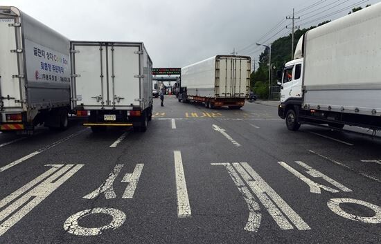 개성공단 정상화 논의를 위한 남북 간 3차 실무회담이 예정된 15일 오전 개성공단 의류·섬유 업종 입주기업 차량들이 물자 반출을 위해 경기 파주시 남북출입국사무소를 통해 개성공단으로 향하고 있다. (사진=뉴시스)