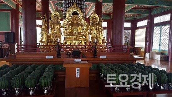 ▲ 진천 보탑사 법당에 보시된 수박들. <사진=민경미 기자>