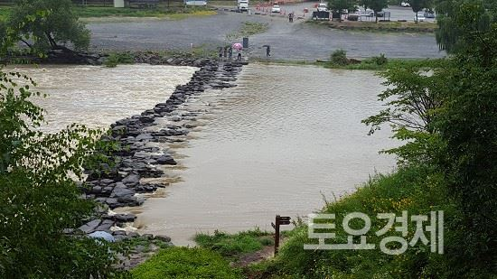 ▲ 진전의 대표적인 명물인 농다리가 장마철을 맞아 범람하고 있다. <사진=민경미 기자>