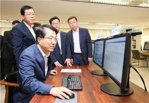 ▲ 진웅섭 금융감독원장이 지난 22일 대부업감독 전산시스템을 점검해보고 있다.<사진=연합>