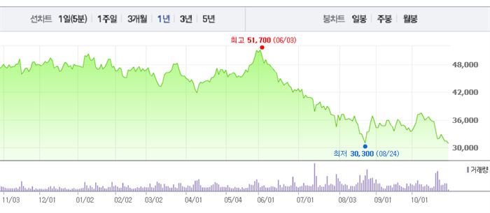 연초 소폭 하락 이후 소폭 약세를 보인 SK하이닉스는 6월 초 5만원을 기점으로 하락세를 기록, 4개월 새 주가가 30% 넘게 빠졌다. SK하이닉스는 PC용 D램 수요 부진에 따른 공급 초과, 중국의 마이크론 인수설 등이 악재로 작용하며 8월 이후 단 한차례도 4만원대를 넘어서지 못했다.