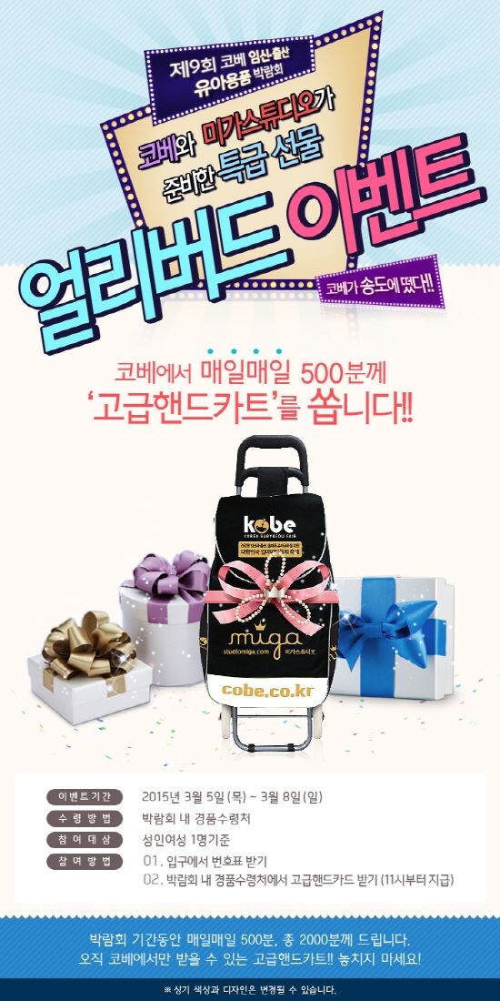얼리버드 이벤트는 전시회장 입구에서 선착순으로 번호표를 지급하며, 지급받은 번호표를 가지고 박람회 내 경품 수령처에 가면 오전 11시부터 고급핸드카트를 받을 수 있다. 단, 박람회 기간 중 일일 한정 500명에 한하며, 성인여성 1명만 가능하다.
