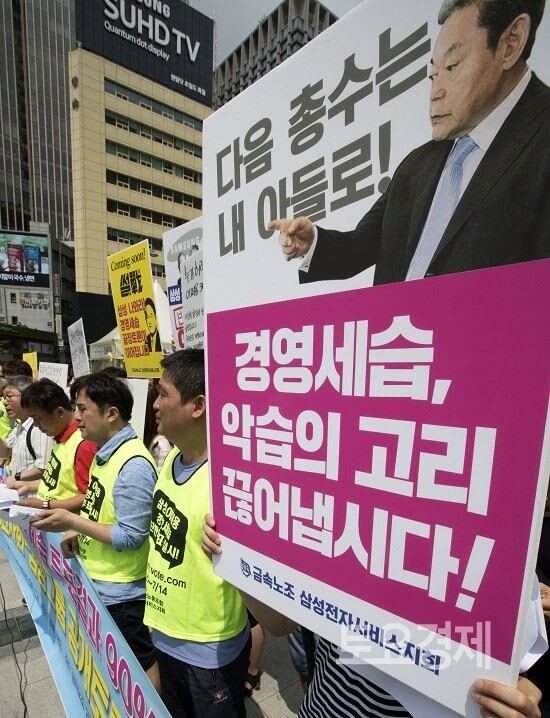 ▲ 지난 26일 오전 서울 광화문광장에서 열린 삼성 경영권 세습 공개토론 제안 기자회견에서 참석자들이 삼성의 경영세습을 비판하는 내용이 적힌 손 피켓을 들고 있다. <사진=연합>