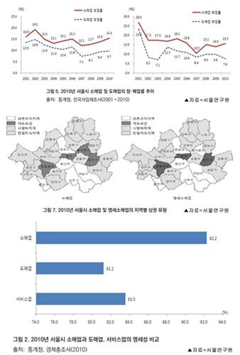 서울연구원이 발표한 연구는 서울의 소매업 특성을 파악하기 위해 지난 10년(2001~2010)간 창업ㆍ폐업률 조사 결과, 통계청의 서비스업총조사와 전국사업체총조사, 경제총조사 등을 활용해 진행됐다.
