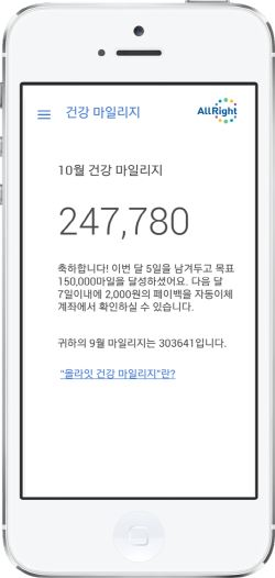 올라잇 코치 앱의 만보기로 기록되는 걸음 수와 식사 기록 중 초록색 음식이 차지하는 비중에 따라 건강 마일리지를 적립한다. 한 걸음 당 1포인트로 초록색 음식 입력 시 하루 최대 2000포인트가 적립된다. 월 15만포인트 이상 적립되면 다음 달에 2000원을 지급한다.