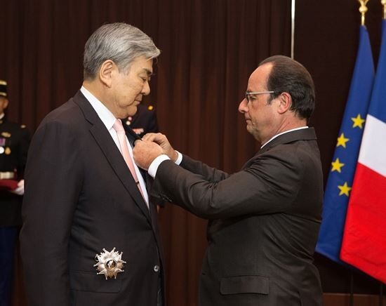 올랑드 대통령은 “이번 훈장 수여는 한·불 양국 경제발전을 위해 노력해주신 조양호 회장의 공헌에 대한 감사의 인사”라며 “프랑스는 조양호 회장과 같은 친구를 갖게 된 것을 행운이라고 생각한다”고 말했다.