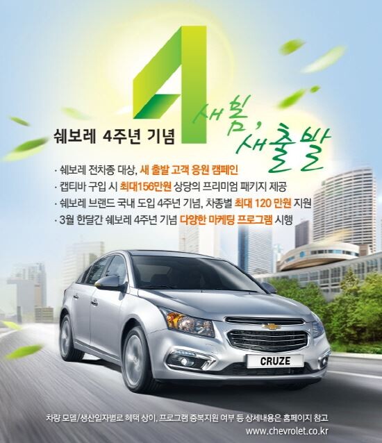 한국지엠 국내영업본부 백범수 전무는 “GM의 글로벌 브랜드인 쉐보레가 고객들의 아낌없는 성원에 힘입어 최근 국내 출범 4주년을 맞이했다”며, “그동안 쉐보레에 대한 고객들의 성원에 보답하고자 3월 한 달 간 ‘새봄, 새출발 페스티벌’을 시행, 보다 풍성하고 다양한 혜택을 제공할 예정”이라고 말했다.