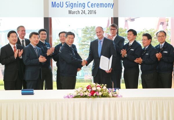 이날 양해각서 체결에는 현대중공업 최길선 회장, 김정환 조선 사업대표(사장), 정기선 기획실 부실장(전무)과 존 라이스 GE 부회장, 팀 슈와이커트 GE 마린 솔루션 사장, 강성욱 GE 코리아 총괄사장 등이 참석했다.