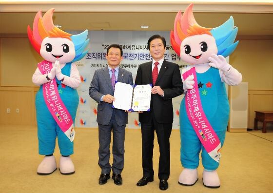 이날 협약에서 이상권 사장과 윤장현 조직위원장은 ‘광주 하계유니버시아드대회’가 세계 각국의 대학생 선수들이 스포츠를 통해 우정을 나누는 성공적인 축제의 장이 되도록 해야 한다는 데 의견을 같이 하고, 필요한 인적․물적 지원을 다해나가기로 했다.