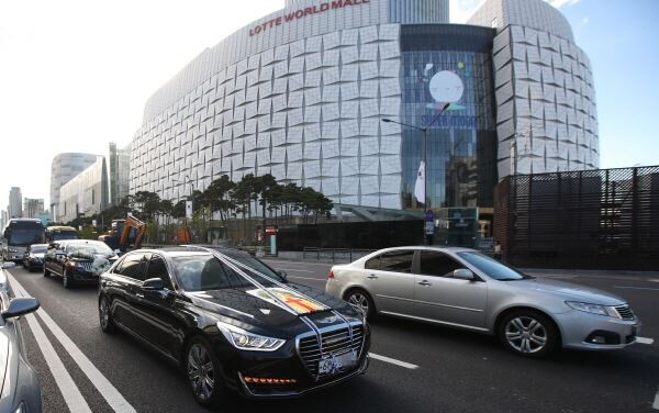 ▲ 고 이인원 롯데그룹 부회장의 발인식이 지난 30일 오전 서울 송파구 서울아산병원 장례식장에서 열렸으며, 운구차량이 롯데월드타워 앞을 지나 추모공원으로 향하고 있다. <사진=연합뉴스>