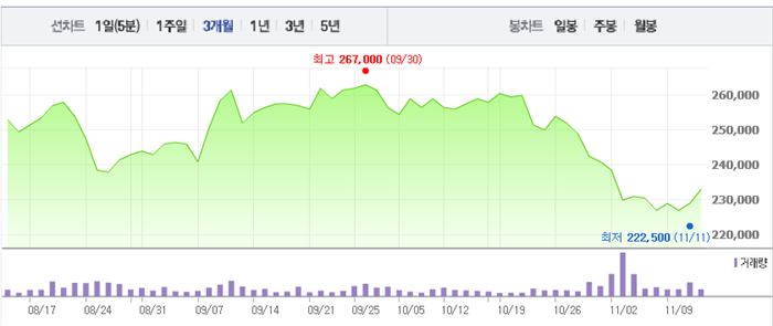 이날 SK텔레콤은 부진한 실적 발표에 3% 넘게 하락, 장 중 23만3000원으로 52주 최저가를 나타냈다. 또한 11일에는 22만2500원으로 또다시 최저치를 기록했다.