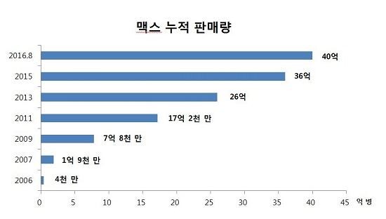 출시 후 꾸준한 인기로 지난해까지 36억 병이 팔린 맥스는 만 10년 만에 40억 병을 넘어섰다. 이는 10년간 1초당 13병씩 판매된 셈이다.