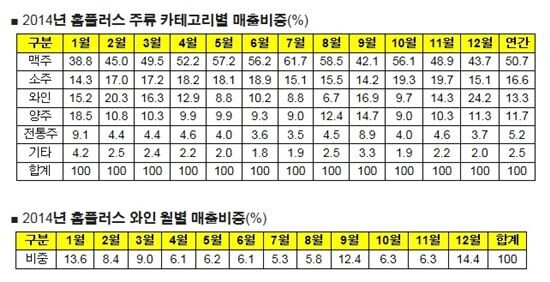 하지만 12월만 보면 소주와 와인의 순위가 역전돼 맥주(43.7%), 와인(24.2%), 소주(15.1%), 양주(11.3%)순으로 매출 비중을 차지했다.
