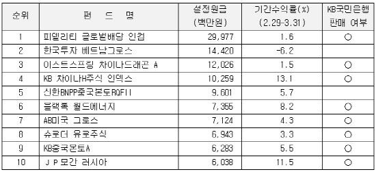 판매량 상위 10개 펀드 중 8개 펀드가 KB국민은행에서 판매중인 펀드이며 판매액은 239억원이고 평균수익률은 6.1%다.