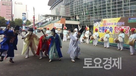 ▲ 동래야류 다섯과장 중 세번째과장인 양반과장이다. 양반과장은 말뚝이 재담의 장으로 무능하고 허례허식에 찬 다섯 양반들이 하인 말뚝이에게 갖은 야유와 모욕과 실랄한 풍자를 당하는 내용이며 말뚝이는 익살과 해학으로 양반을 여지없이 조롱하며 양반에 대한 평민의 반항을 줄거리로 하는 내용이다.