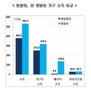 전체 맞벌이 가구의 가구주 소득은 평균 319만6000원, 배우자 소득은 136만6000원으로 나타났고, 비맞벌이 가구의 가구주 소득은 252만3000원, 배우자 소득은 8만8000원이었다.