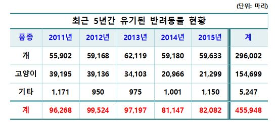 국회 농림축산식품해양수산위원회 이완영 의원(새누리당, 경북 칠곡·성주·고령)이 농림축산식품부로부터 제출 받은 자료에 따르면 최근 5년간(2011~2015년) 유기된 반려동물은 46만여 마리로 개가 30여만 마리(65%), 고양이가 15만 마리(34%)인 것으로 나타났다.