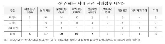 또한 국내기업의 피해접수를 전담하는 ‘수출입 화물 물류애로 신고센터’(무역협회 운영)에 9월 18일까지 접수된 피해건수는 397건으로 피해규모는 1.47억 달러에 달하는 것으로 알려졌다.