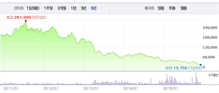 2011년 7월 22일에는 28만1000원을 기록했지만 다음해 12월 21에는 17만7000원으로 10만원 가까이 밀렸다.