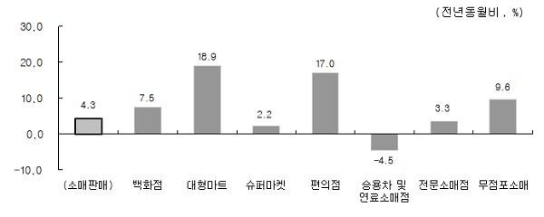 전반적인 소비 흐름이 점차 약해짐에 따라 저유의 효과 역시 사라질 것으로 예상한다. 정책효과를 제외한 소비 흐름은 아직까진 양호하나 저유가에 따른 국민소득 증대 효과가 점차 영향을 미칠 것으로 판단된다. 개별소비세 인하 조치의 종료가 수명이 긴 재화의 소비를 크게 위축시키면서 전반적으로 소비가 절감되었다. 이와 같은 현상에 ‘소비절벽’이라는 경기 불황 증세에 대한 불안정한 심리로 인해 소비하지 않는 현상을 뜻하는 신조어까지 생겨났다. 정체된 민간 소비는 최저임금 상승, 소비심리 개선 등 긍정적인 영향에도 불구하고 소비를 억누르는 구조적 요인에 닥쳐있다. 이는 인구 고령화 진전 및 주거비 부담 등의 단기간에는 개선되기 어려운 문제들이 놓여있기 때문이다. (소비형태를 보여주는 소매 업태별 판매 <그림 2=통계청>참조)