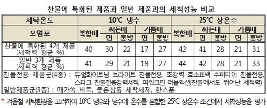 또 찬물 전용 세제가 찬물에서의 세척력에서 일반 세제와 별반 다르지 않은 것으로 조사됐다.