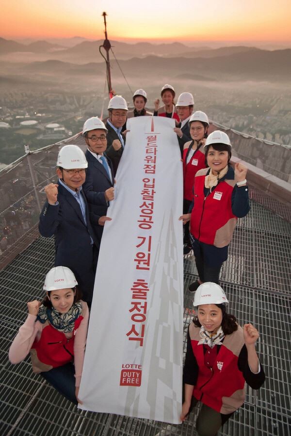 ▲ 4일 롯데면세점은 신규 특허 입찰 제안서 제출에 앞서, 장선욱 롯데면세점 대표, 문근숙 노조위원장 등 노사 대표와 월드타워점 폐점 이후 휴직자 대표가 월드타워 123층 전망대에 올라 일출을 함께 맞으며 특허 획득을 위한 의지를 다졌다. 사진은 왼쪽 앞에서부터 김희경 롯데면세점 월드타워점 휴직자, 최병록 롯데면세점 지원부문장, 장선욱 롯데면세점 대표, 심우진 롯데면세점 영업부문장, 박정선 롯데면세점 월드타워점 휴직자. 오른쪽 앞에서부터 서영희 롯데면세점 월드타워점 휴직자, 김금주 롯데면세점 노조부위원장, 문근숙 롯데면세점 노조위원장, 이동대 롯데면세점 월드타워점 점장, 심지영 롯데면세점 휴직자. <사진=롯데면세점>