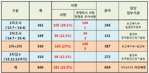 지난 1·2차 조사에서는 피해 인정 신청을 한 530명에 대해 폐질환과 인과관계를 조사했고 그 중 221명이 피해를 인정받았다.