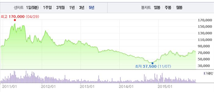 하지만 올해 1월 6일 4만5100원을 기록한 뒤 지난 4월 24일에는 7만9600원으로 넉 달 여 만에 70% 이상 뛰어오르며 연중최고치를 기록했다. 14일에는 7만2500원을 기록했다.