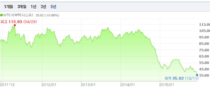 뉴욕상업거래소에 따르면 WTI는 지난 2011년 4월 29일 113.93달러를 기록했지만 지난해 하반기를 기점으로 급락하기 시작해 지난해 12월26일에는 54.73달러를 나타냈다.