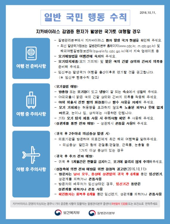여행객은 현지에서 모기를 조심하고 여행 후에도 1개월간 헌혈 금지·6개월간 임신 연기·콘돔 사용 등의 행동 수칙을 준수할 것을 강조했다.