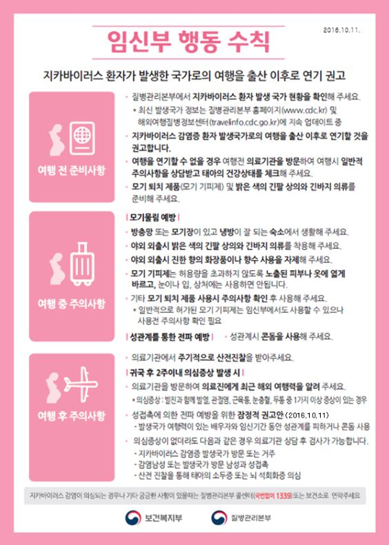 만약 지카 감염 위험에 노출된 경우는 지카 검사를 받고 산부인과 전문의 상담을 받을 것을 권고했다.
