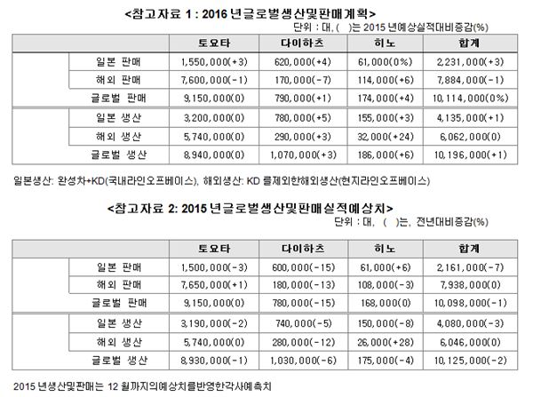 또 2016년도 글로벌 생산 및 판매계획은 각각1019만6000대, 1011만4000대로 수립했다.