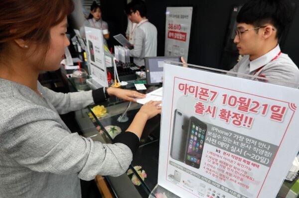 ▲ 이동통신 3사가 아이폰7과 아이폰7플러스의 예약판매를 시작한 14일 서울 광화문 KT 올레스퀘어에서 한 시민이 아이폰과 관련한 상담을 하고 있다. <사진=연합뉴스>
