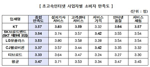 이번 조사는 설치기사 서비스, 고객센터 서비스, 서비스 가격, 인터넷 품질, 서비스 체험 등 5개 항목으로 조사됐으며 KT는 이 중 서비스 가격을 제외한 4개 항목에서 1위(3.57)를 차지했다.