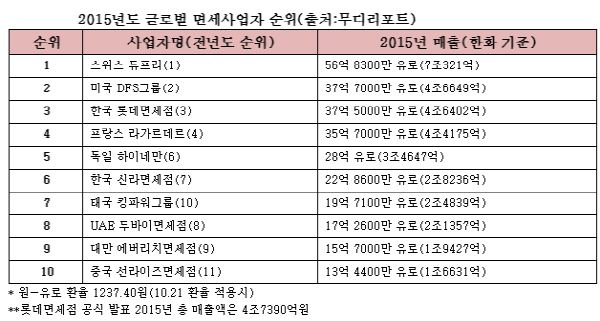 최근 발간된 영국의 유통전문지 무디리포트에 따르면 롯데면세점은 2015년도 매출 기준 세계 면세사업자 순위에서 37억5000만유로의 실적을 올려 56억8300만유로의 스위스 듀프리(Dufry)와 37억7000만유로의 미국 디에프에스그룹(DFS)에 이어 2년 연속 3위를 차지했다.