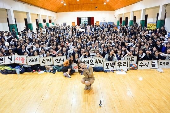 ▲ 경북 영천 여자고등학교 학생들이 수지의 깜짝 방문 이벤트에 즐거운 시간을 보내고 있다. <사진=광동제약>