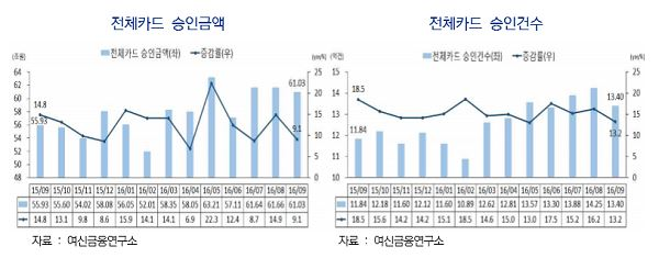 27일 여신금융연구소에 따르면 지난 9월 전체 카드 승인금액은 61조300억원으로 전년 같은 달보다 9.1% 증가했다.