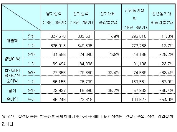 이와 함께, 회사 측은 순이익 변동 폭이 컸던 이유는 일동제약 주식 처분으로 일회성 이익이 반영됐던 작년 3분기 대비 역기저 효과가 나타난 탓이라고 설명했다.