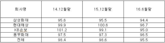 올 6월 말 기준 주요 손보사들의 손해율 현황을 살펴보면 현대해상이 96.7%로 6개월 전보다 3.9%포인트 낮아졌다. 이어 삼성화재가 94.4%로 같은 기간 보다 1.1%포인트 하락했으며 동부화재는 96.5%로 0.8%포인트, KB손보는 95.0%로 4.1%포인트 각각 하락했다.