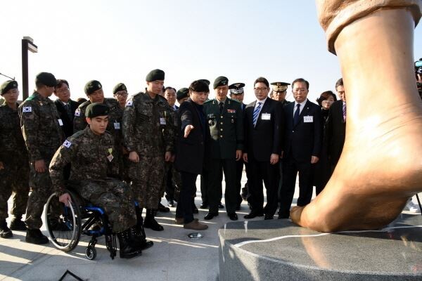 ▲ 23일 경기도 파주시 임진각 평화누리공원에서 효성 조현준 사장(오른쪽에서 세번째)과 김정원 하사, 하재헌 하사 등이 참석한 가운데 8·4 DMZ 작전에 참여한 육군 1군단 수색대대 장병들의 전공을 기념하는 ‘평화와 하나됨을 향한 첫 걸음-평화의 발’ 제막식에서 조형물에 대해 설명하고 있다. <사진=효성>