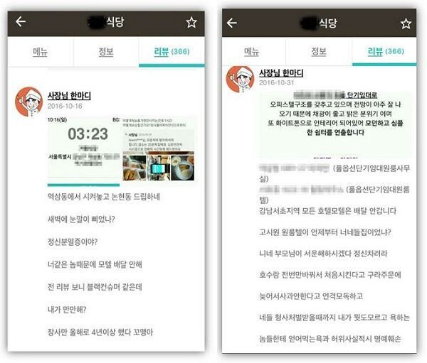 해당 이용자들은 “이 사장은 자신의 마음에 들지않는 리뷰를 올리면 본인의 블로그와 배달의민족 어플 리뷰에 카톡 전문과 주소 등을 캡쳐 해 올리고 개인연락처를 알아내 비방과 욕설을 일삼았다”고 말했다.
