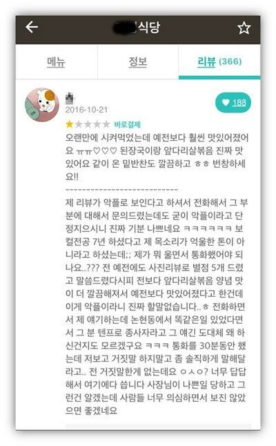 그러나 사장은 이 리뷰가 “악플로 보인다”며 리뷰게시판에 개인 메신저를 통해 협박성 메시지를 보내고 이를 게시했다.