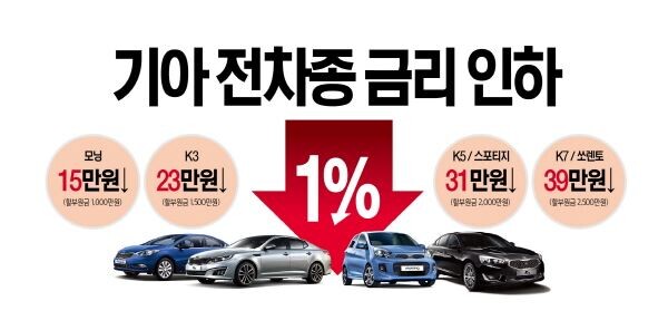 7일 기아차에 따르면 우선 원리금 균등납부 방식 구입시 선수금 15%이상 납부를 전제로 기존 5.9% 금리가 4.9%(12/24/36개월), 6.9%(48개월)에서 5.9%, 7.5%(60개월)는 5.9%로 평균 1%P 할부금리가 내려간다.