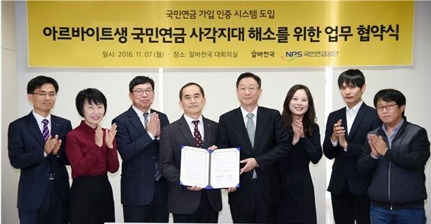 [토요경제=윤영한 기자] 국민연금공단(이사장 문형표)은 구인․구직 포털 서비스 알바천국(대표 최인녕)과 국민연금 사각지대 해소를 위한 업무협약을 체결했다고 7일 밝혔다.