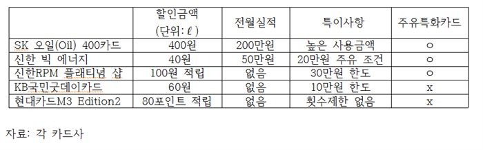 주유특화카드로서 역대 최고 수준인 리터당 최대 400원 할인이라는 솔깃한 문구를 내세웠다.