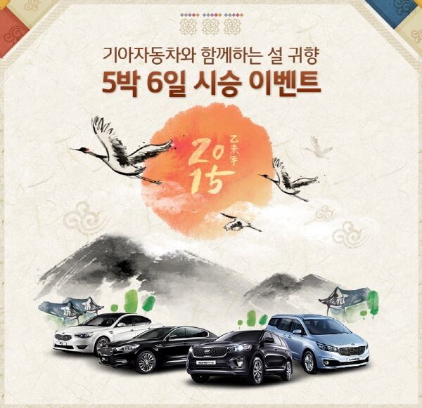 이와 관련 기아차는 전국 18개 드라이빙센터에서 ▲K7 2015 ▲더 뉴 K9 ▲올 뉴 쏘렌토 ▲올 뉴 카니발을 귀향차량으로 지원한다. 만21세이상 운전면허 소지자면 누구나 오는 2월 8일까지 기아차 홈페이지(http://www.kia.com) 이벤트 페이지에서 신청이 가능하다.