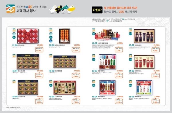 1월 16일부터 2월 23일까지 사과세트, 곶감, 스팸, 위생용품 등 12종에 대해 팝카드로 결제 시 25% 캐시백 혜택을 제공하며(GS&POINT로 캐시백, 최대 2만포인트 한도), 같은 기간 굴비, 갈치, 수삼더덕세트, 밀폐용기 등 12종을 GS&POINT로 적립하는 고객은 2.5% 추가 적립 받을 수 있다.