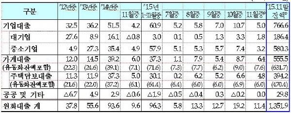 금감원은 지난달 기업대출이 중소기업의 결제성자금 대출 상환으로 인해 10월말 보다 증가폭이 5조원 축소됐다고 분석했다.