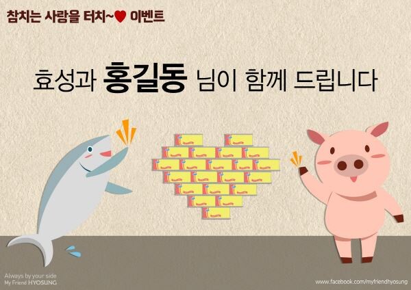 이와 관련 효성은 14일 공식 페이스북(http://www.facebook.com/myfriendhyosung)에서 지난 2일부터 11일까지 진행한 '사랑의 참치&햄 전달 이벤트'에서 희망의 메시지를 댓글로 남긴 네티즌 명의로 총 77가구에 참치&햄세트를 기부한다고 밝혔다. 효성은 또 해당 네티즌의 이름으로 물품이 전달되는 모습을 담은 사진을 15일 페이스북에 올릴 예정이다.